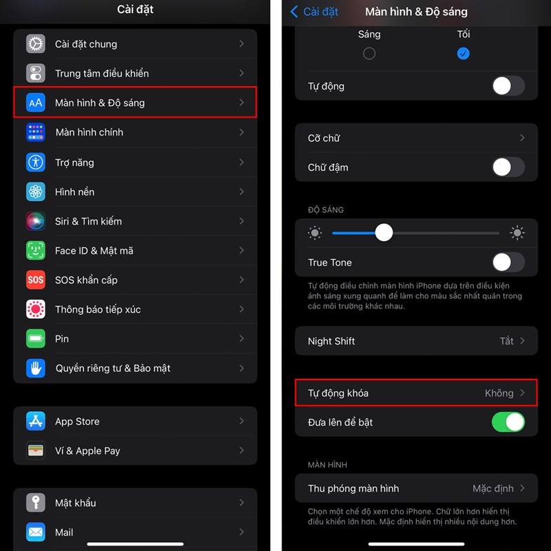 Bước 1: Đầu tiên, bạn hãy truy cập vào Cài đặt của máy > Chọn vào Màn hình & Độ sáng > Nhấn vào Tự động khóa.