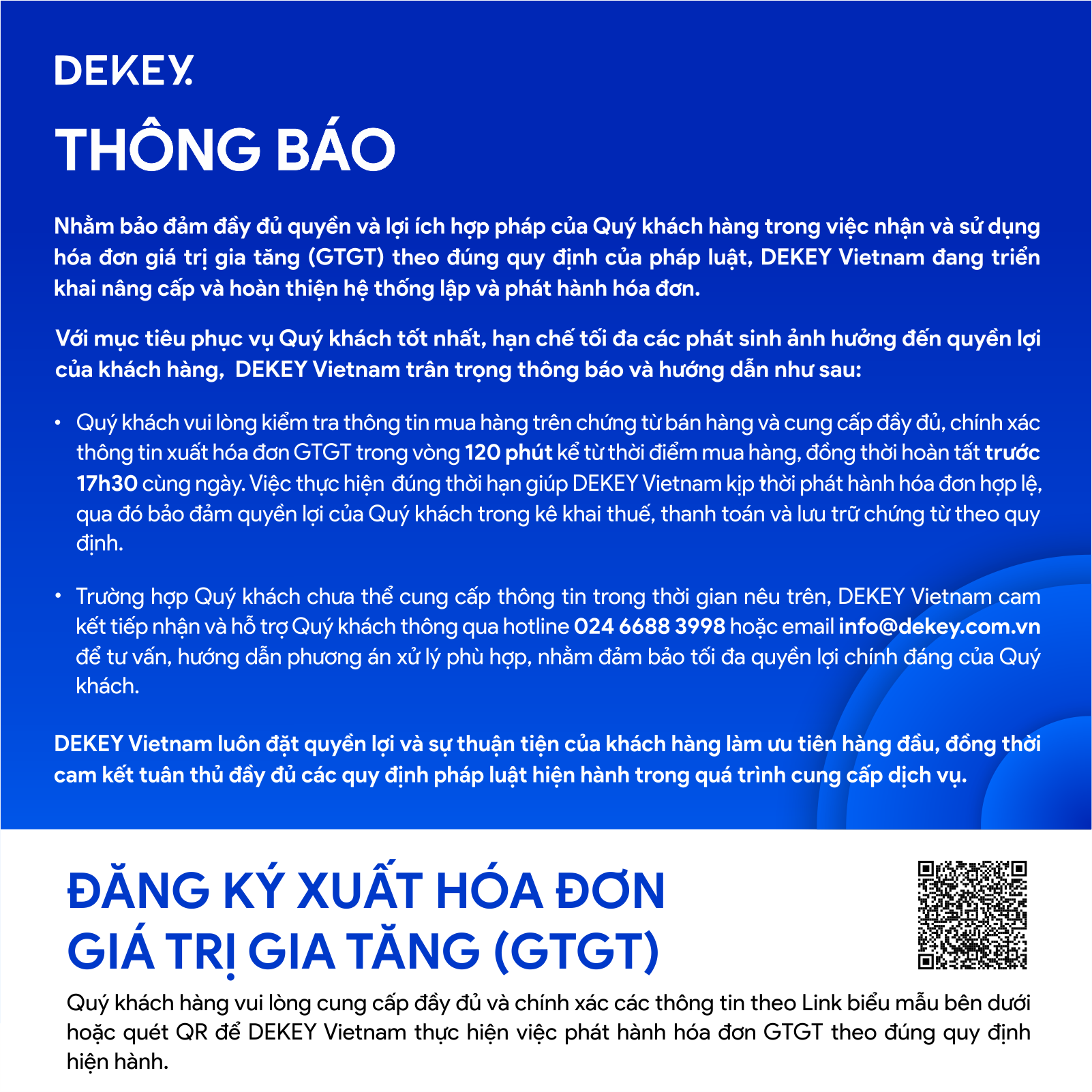 Nhằm đảm bảo việc lập và phát hành hóa đơn giá trị gia tăng (GTGT) đúng quy định pháp luật, đồng thời bảo vệ đầy đủ quyền và lợi ích hợp pháp của Quý Khách hàng, DEKEY Vietnam trân trọng thông báo: